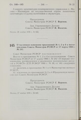 Постановление Совета Министров РСФСР. О частичном изменении приложений № 1, 2 и 4 к постановлению Совета Министров РСФСР от 17 марта 1966 г. № 242. 27 ноября 1970 г. № 655