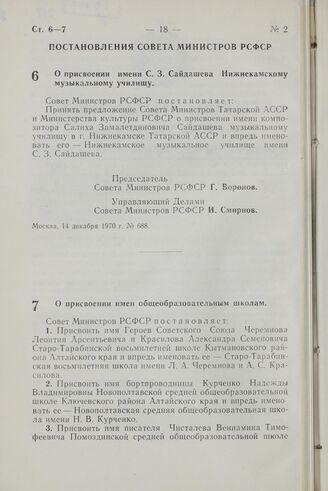Постановление Совета Министров РСФСР. О присвоении имени С.З. Сайдашева Нижнекамскому музыкальному училищу. 14 декабря 1970 г. № 688