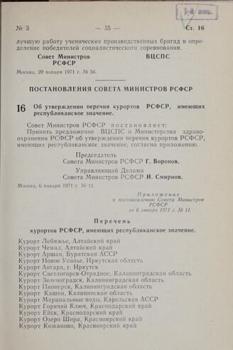 Постановление Совета Министров РСФСР. Об утверждении перечня курортов РСФСР, имеющих республиканское значение. 6 января 1971 г. № 11