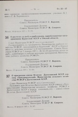 Постановление Совета Министров РСФСР. О расчетах за рыбу и рыботовары, вырабатываемые предприятиями Бурятской АССР и Омской области. 17 февраля 1971 г. № 103