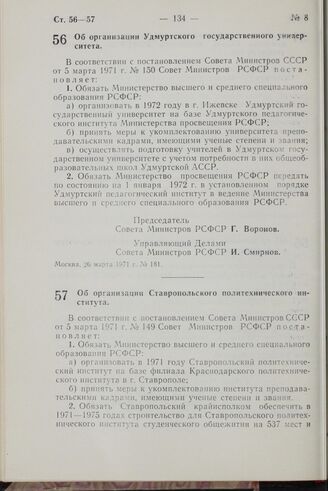 Постановление Совета Министров РСФСР. Об организации Ставропольского политехнического института. 26 марта 1971 г. № 182