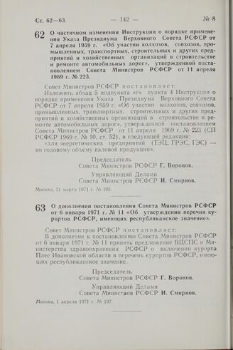 Главная Собрание законов и распоряжений правительства РСФСР и СССР Собрание законов и распоряжений Рабоче-Крестьянского Правительства ... Собрание постановлений правительства РСФСР за 1971 г. № 1-22 Документы Постановление Совета Министров РСФСР. О частичном изменении Инструк...