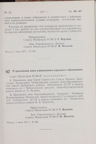 Постановление Совета Министров РСФСР. О присвоении имен учреждениям народного образования. 7 июля 1971 г. № 365
