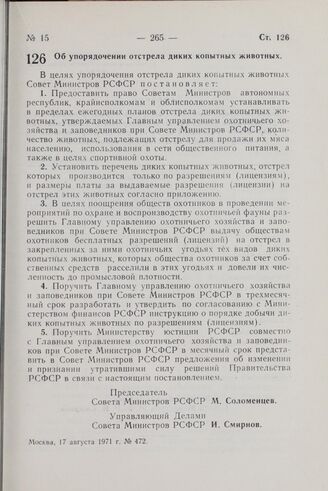 Постановление Совета Министров РСФСР. Об упорядочении отстрела диких копытных животных. 17 августа 1971 г. № 472