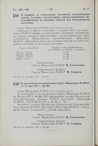 Постановление Совета Министров РСФСР. О тарифах за пользование легковыми автомобилями (кроме легковых таксомоторов), предоставляемыми автохозяйствами по разовым заказам для обслуживания населения. 21 сентября 1971 г. № 527