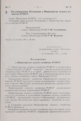 Постановление Совета Министров РСФСР. Об утверждении Положения о Министерстве лесного хозяйства РСФСР. 15 декабря 1971 г. № 661