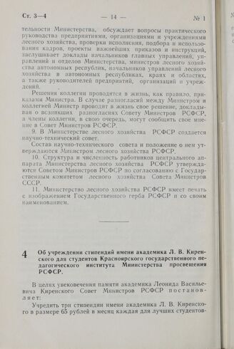 Постановление Совета Министров РСФСР. Об учреждении стипендий имени академика Л.В. Корейского для студентов Красноярского государственного педагогического института Министерства просвещения РСФСР. 18 декабря 1971 г. № 678