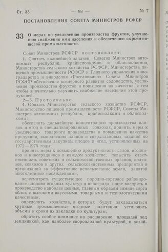 Постановление Совета Министров РСФСР. О мерах по увеличению производства фруктов, улучшению снабжения ими населения и обеспечению сырьем пищевой промышленности. 9 февраля 1972 г. № 94