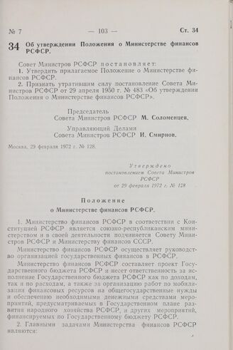 Постановление Совета Министров РСФСР. Об утверждении Положения о Министерстве финансов РСФСР. 29 февраля 1972 г. № 128