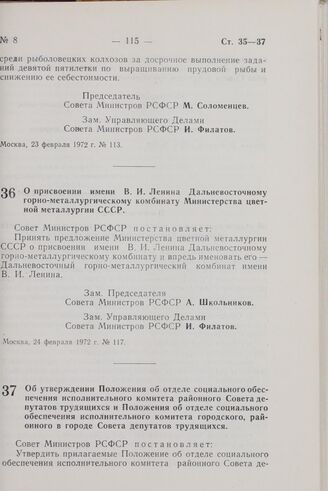 Постановление Совета Министров РСФСР. Об утверждении Положения об отделе социального обеспечения исполнительного комитета районного Совета депутатов трудящихся и Положения об отделе социального обеспечения исполнительного комитета городского, районного в городе Совета депутатов трудящихся. 29 февраля 1972 г. № 124