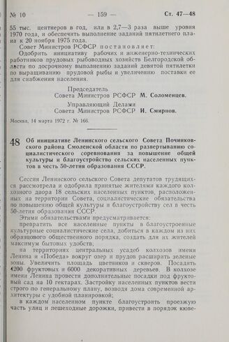 Постановление Совета Министров РСФСР. Об инициативе Ленинского сельского Совета Починковского района Смоленской области по развертыванию социалистического соревнования за повышение общей культуры и благоустройство сельских населенных пунктов в честь 50-летия образования СССР. 15 марта 1972 г. № 167