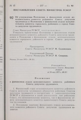 Постановление Совета Министров РСФСР. Об утверждении Положения о финансовом отделе исполнительного комитета районного Совета депутатов трудящихся и Положения о финансовом отделе исполнительного комитета городского, районного в городе Совета депутатов трудящихся. 24 мая 1972 г. № 311