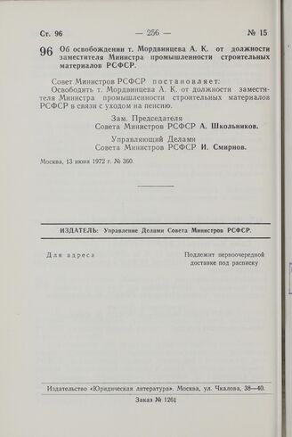 Постановление Совета Министров РСФСР. Об освобождении т. Мордвинцева А.К. от должности заместителя Министра промышленности строительных материалов РСФСР. 13 июня 1972 г. № 360