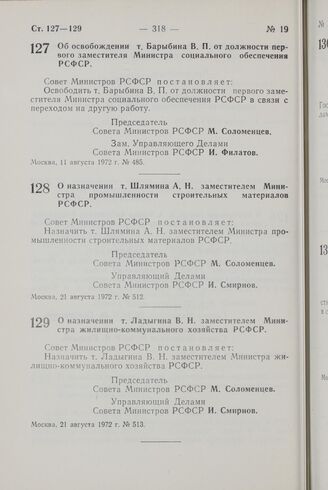 Постановление Совета Министров РСФСР. О назначении т. Ладыгина В.Н. заместителем Министра жилищно- коммунального хозяйства РСФСР. 21 августа 1972 г. № 513