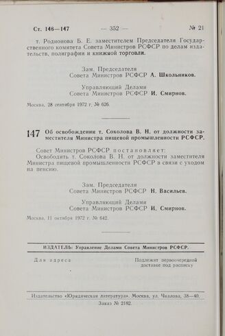 Постановление Совета Министров РСФСР. Об освобождении т. Соколова В.Н. от должности заместителя Министра пищевой промышленности РСФСР. 11 октября 1972 г. № 642