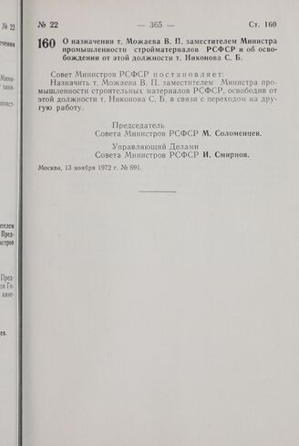 Постановление Совета Министров РСФСР. О назначении т. Можаева В.П. заместителем Министра промышленности стройматериалов РСФСР и об освобождении от этой должности т. Никонова С.Б. 13 ноября 1972 г. № 691