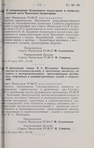 Постановление Совета Министров РСФСР. О наименовании безымянного полуострова в северо-восточной части Чукотского полуострова. 30 марта 1973 г. № 168