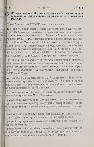 Постановление Совета Министров РСФСР. Об организации Научно-исследовательского института садоводства Сибири Министерства сельского хозяйства РСФСР. 22 августа 1973 г. № 440