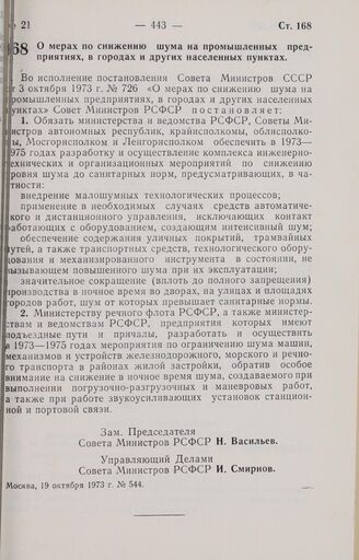 Постановление Совета Министров РСФСР. О мерах по снижению шума на промышленных предприятиях, в городах и других населенных пунктах. 19 октября 1973 г. № 544