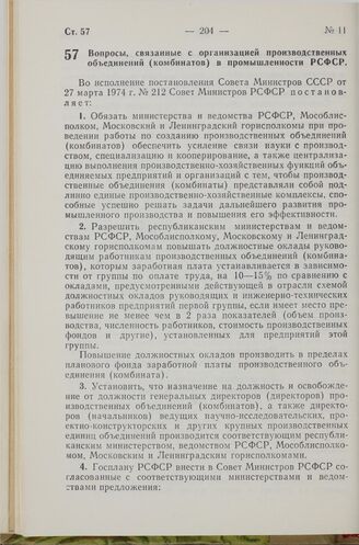 Постановление Совета Министров РСФСР. Вопросы, связанные с организацией производственных объединений (комбинатов) в промышленности РСФСР. 10 апреля 1974 г. № 216