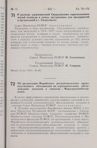 Постановление Совета Министров РСФСР. Об организации Марийского республиканского производственного объединения по агрохимическому обслуживанию колхозов и совхозов — Марагрохимобъединения. 24 мая 1974 г. № 300