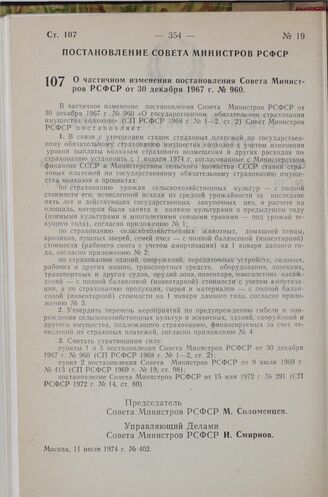 Постановление Совета Министров РСФСР. О частичном изменении постановления Совета Министров РСФСР от 30 декабря 1967 г. № 960. 11 июля 1974 г. № 402
