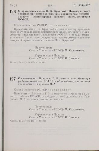 Постановление Совета Министров РСФСР. О назначении т. Балакина Г. Н. заместителем Министра рыбного хозяйства РСФСР и об освобождении от этой должности т. Гаврилова М. А. 13 августа 1974 г. № 468
