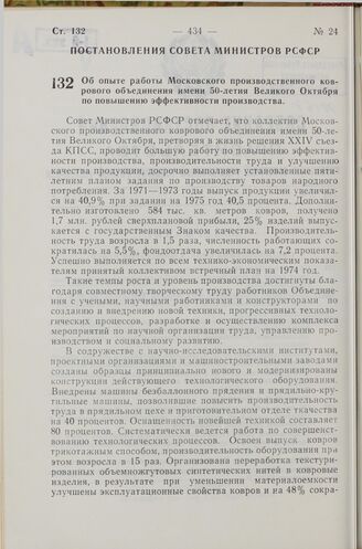 Постановление Совета Министров РСФСР. Об опыте работы Московского производственного коврового объединения имени 50-летия Великого Октября по повышению эффективности производства. 14 сентября 1974 г. № 507