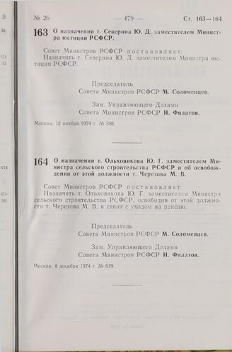 Постановление Совета Министров РСФСР. О назначении т. Ольховикова Ю. Г. заместителем Министра сельского строительства РСФСР и об освобождении от этой должности т. Черезова М. В. 4 декабря 1974 г. № 619