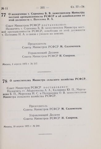 Постановление Совета Министров РСФСР. О назначении т. Сорокина Б.В. заместителем Министра местной промышленности РСФСР и об освобождении от этой должности т. Потехина Н.А. 4 апреля 1975 г. № 217