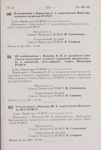 Постановление Совета Министров РСФСР. О назначении т. Поленова Ю.А. заместителем Начальника ЦСУ РСФСР. 23 мая 1975 г. № 335