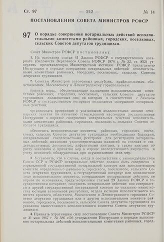 Главная Собрание законов и распоряжений правительства РСФСР и СССР Собрание законов и распоряжений Рабоче-Крестьянского Правительства ... Собрание постановлений правительства РСФСР за 1975 г. № 1-22 Документы Постановление Совета Министров РСФСР. О порядке совершения нотариал...