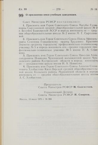 Постановление Совета Министров РСФСР. О присвоении имен учебным заведениям. 18 июня 1975 г. № 380
