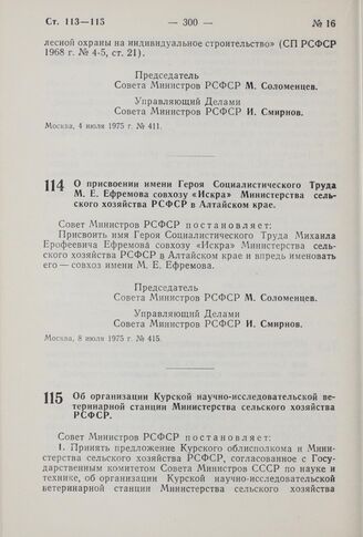 Постановление Совета Министров РСФСР. О присвоении имени Героя Социалистического Труда М.Е. Ефремова совхозу «Искра» Министерства сельского хозяйства РСФСР в Алтайском крае. 8 июля 1975 г. № 415