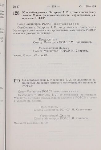 Постановление Совета Министров РСФСР. Об освобождении т. Ипатьевой Т.Л. от должности заместителя Министра бытового обслуживания населения РСФСР. 28 июля 1975 г. № 439