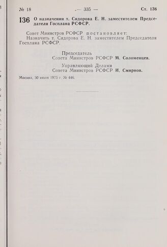 Постановление Совета Министров РСФСР. О назначении т. Сидорова E.Н. заместителем Председателя Госплана РСФСР. 30 июля 1975 г. № 446
