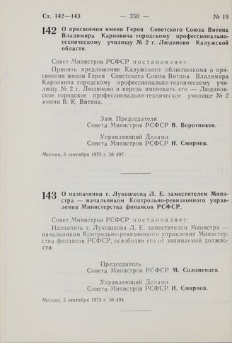 Постановление Совета Министров РСФСР. О присвоении имени Героя Советского Союза Витина Владимира Карповича городскому профессионально-техническому училищу № 2 г. Людиново Калужской области. 5 сентября 1975 г. № 497