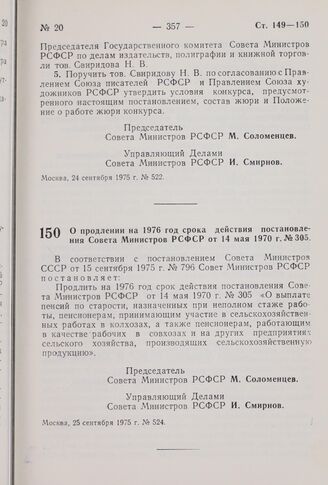 Постановление Совета Министров РСФСР. О продлении на 1976 год срока действия постановления Совета Министров РСФСР от 14 мая 1970 г. № 305. 25 сентября 1975 г. № 524