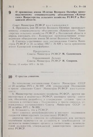 Постановление Совета Министров РСФСР. О присвоении имени 50-летия Великого Октября производственному птицеводческому объединению «Каширское» Министерства сельского хозяйства РСФСР в Московской области. 12 ноября 1975 г. № 595