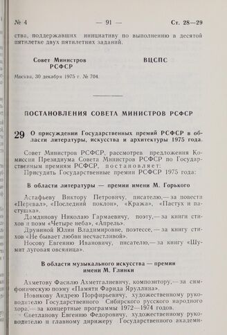 Постановление Совета Министров РСФСР. О присуждении Государственных премий РСФСР в области литературы, искусства и архитектуры 1975 года. 23 декабря 1975 г. № 674