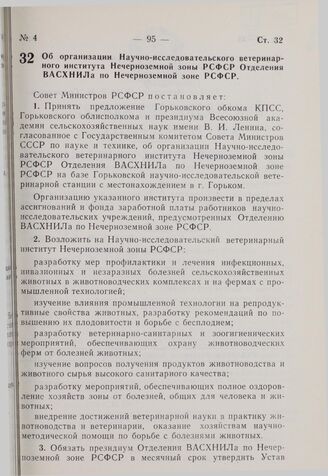 Постановление Совета Министров РСФСР. Об организации Научно-исследовательского ветеринарного института Нечерноземной зоны РСФСР Отделения ВАСХНИЛа по Нечерноземной зоне РСФСР. 30 декабря 1975 г. № 703