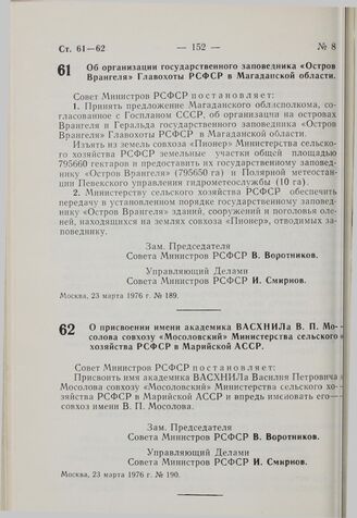 Постановление Совета Министров РСФСР. О присвоении имени академика ВАСХНИЛа В.П. Мосолова совхозу «Мосоловский» Министерства сельского хозяйства РСФСР в Марийской АССР. 23 марта 1976 г. № 190