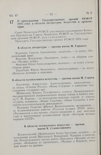 Постановление Совета Министров РСФСР. О присуждении Государственных премий РСФСР 1976 года в области литературы, искусства и архитектуры. 23 декабря 1976 г. № 677