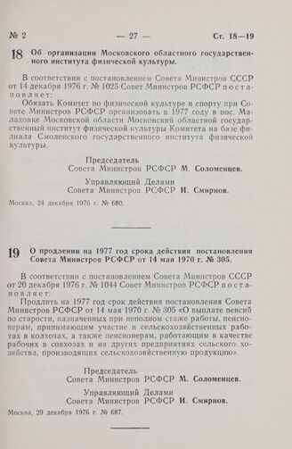 Постановление Совета Министров РСФСР. О продлении на 1977 год срока действия постановления Совета Министров РСФСР от 14 мая 1970 г. № 305. 29 декабря 1976 г. № 687