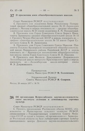 Постановление Совета Министров РСФСР. О присвоении имен общеобразовательным школам. 28 января 1977 г. № 70