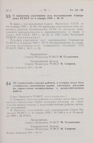 Постановление Совета Министров РСФСР. О признании утратившим силу постановления Совнаркома РСФСР от 8 января 1946 г. № 15. 14 февраля 1977 г. № 109