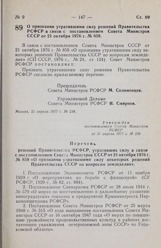 Постановление Совета Министров РСФСР. О признании утратившими силу решений Правительства РСФСР в связи с постановлением Совета Министров СССР от 21 октября 1976 г. № 859. 21 апреля 1977 г. № 238
