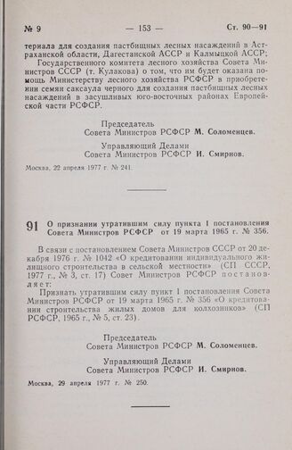 Постановление Совета Министров РСФСР. О признании утратившим силу пункта 1 постановления Совета Министров РСФСР от 19 марта 1965 г. № 356. 29 апреля 1977 г. № 250