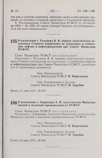 Постановление Совета Министров РСФСР. О назначении т. Свиридова А.И. заместителем Министра мясной и молочной промышленности РСФСР. 24 июня 1977 г. № 350