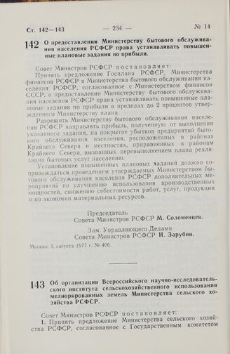 Постановление Совета Министров РСФСР. О предоставлении Министерству бытового обслуживания населения РСФСР права устанавливать повышенные плановые задания по прибыли. 5 августа 1977 г. № 406
